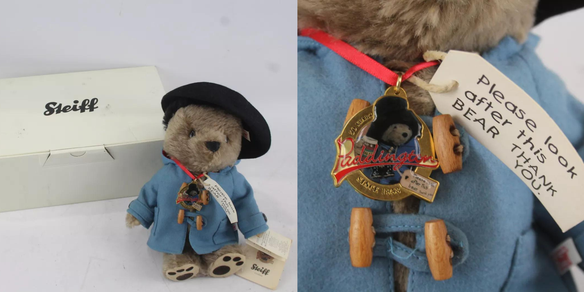 Steiff, a renowned German teddy bear manufacturer, has released several limited edition Paddington Bears, often made from premium materials such as mohair and are produced in limited quantities, making them valuable among collectors. These bears are also distinguished by the signature Steiff "Button in Ear," which marks their authenticity. Limited editions, particularly those released in collaboration with anniversaries or special events like the Steiff Paddington Bear pictured below, add an extra layer of exclusivity, driving demand and prices up in the collectors' market.